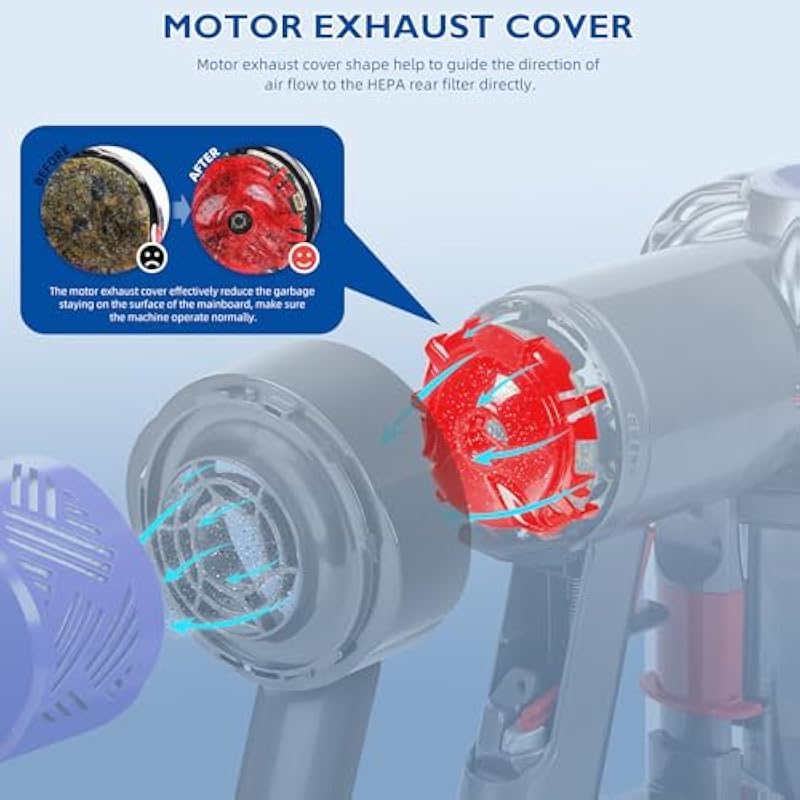 - Function of Motor Exhaust Cover: The v6 motor exhaust cover can guide the direction of air flow, bring the garbage in the air to the hepa rear filter directly, effectively reduce the garbage staying on the surface of the mainboard and protect it
