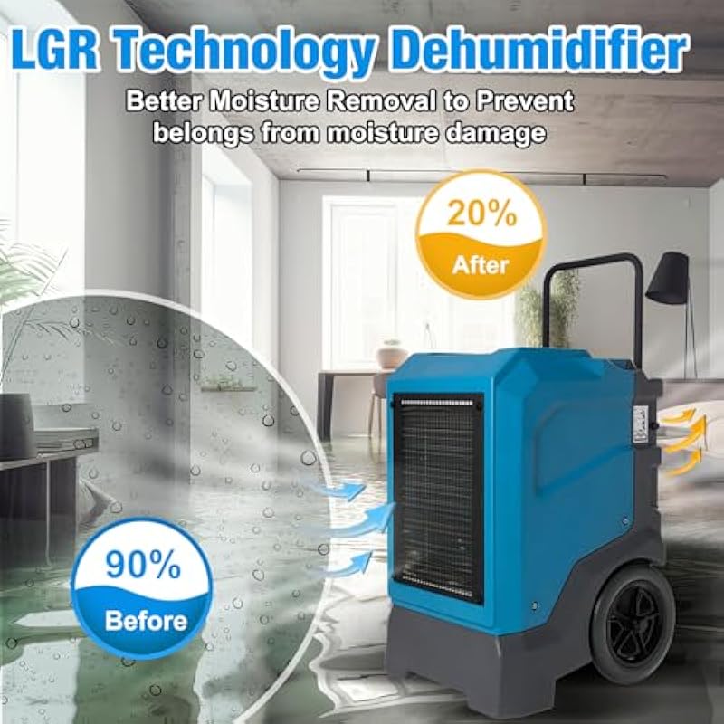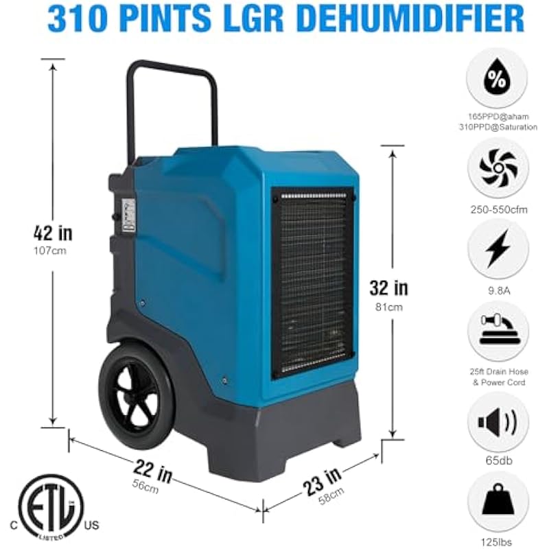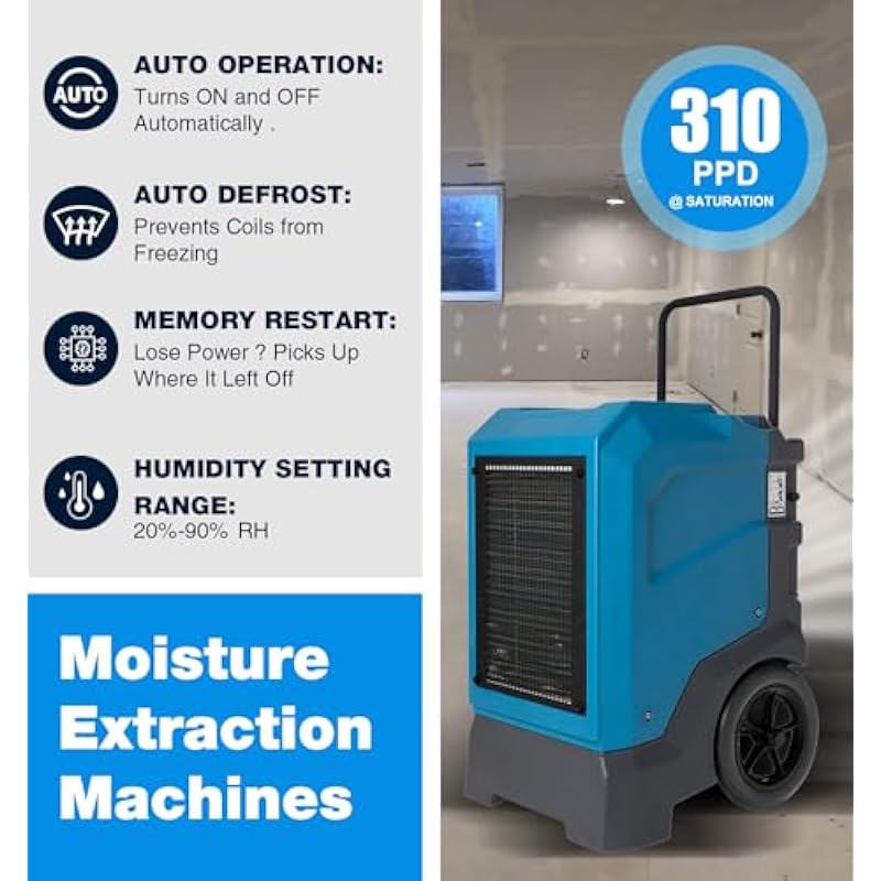- Powerful Moisture Removal: Capable of removing up to 310 PPD (pints per day) at saturation and 165 PPD at AHAM conditions, while only consuming 10.5A of power. With a COP of 2.9 L/Kwh, this dehumidifier offers a super-efficient moisture removal solution for large spaces and restoration jobs.