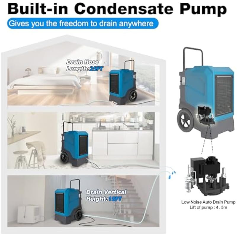 - Built-In Condensate Pump: Equipped with a 15-foot lift head, the condensate pump allows continuous drainage, even from basements or below-grade areas, eliminating the need for manual emptying.
