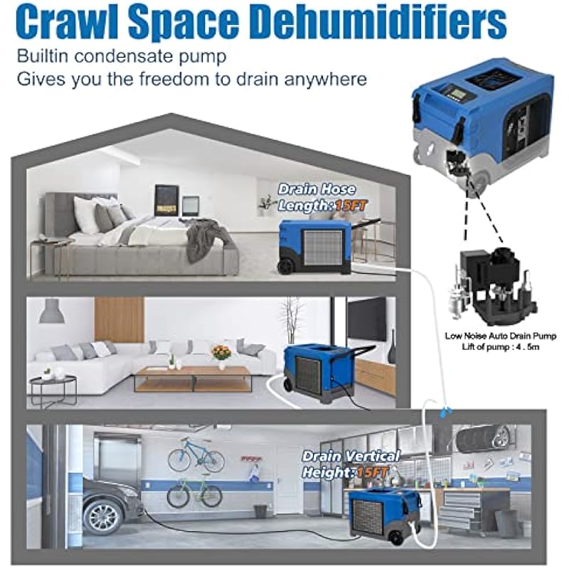 - come equipped with a built-in condensate pump with 15ft lift head, can drain water from basement
