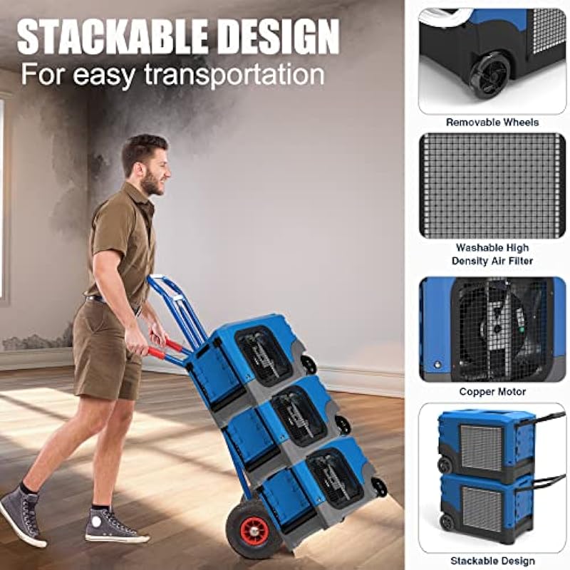 - Comes back after power failure, no need to turn on manually, this water damage Restoration dehumidifier designed with Rigid handle and semi-pneumatic wheels to facilitate transport.