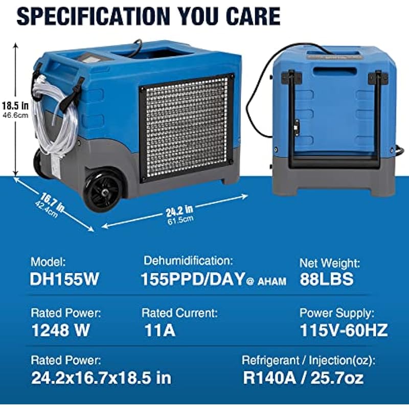 | Included Components | Built-in Pump, 25ft Drain Hoses and Power Cord, Handle and wheels, LED Display w/ Wifi Contorl |