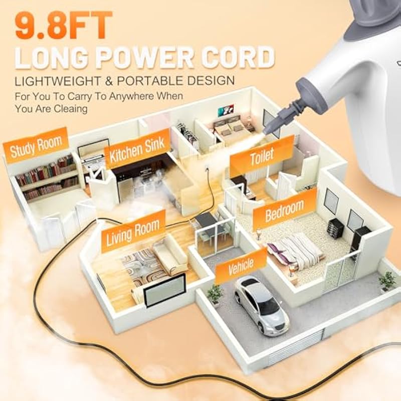 - 【 Handheld Steamer for Cleaning】 With its 9.8 ft (3 m) cord, our steam cleaner is designed for easy portability between rooms, offering greater flexibility for cleaning anywhere in your house