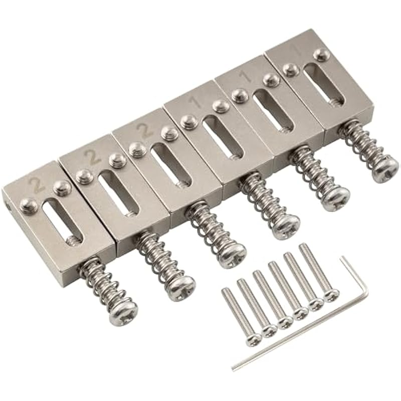 - Solid brass material with precise digital CNC processing technic, durable and stable, brings better sustain. Modern style rectangle roller saddles greatly reduce string breakage, increase sustain and tuning stability