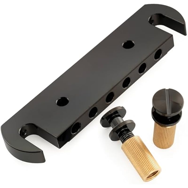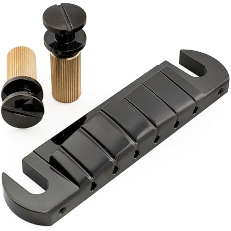 - Compensated string guide improves intonation over plain tailpiece style, specially shaped string slots to avoid buzzing, hex screws move the whole bridge forward and backwards to aid intonation