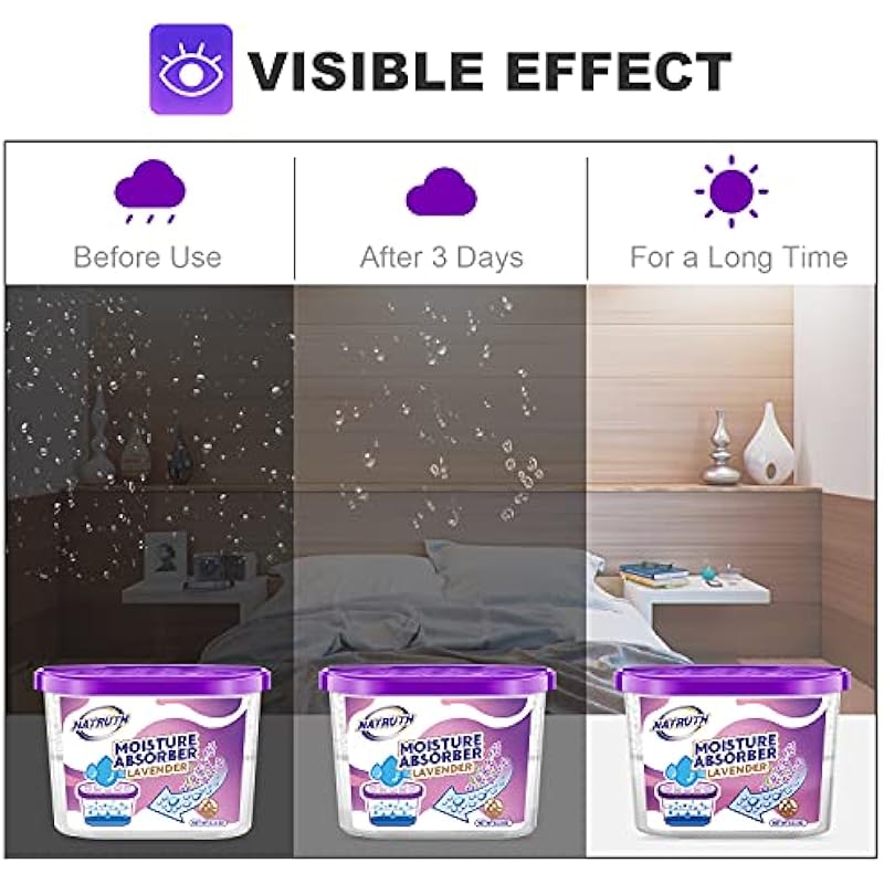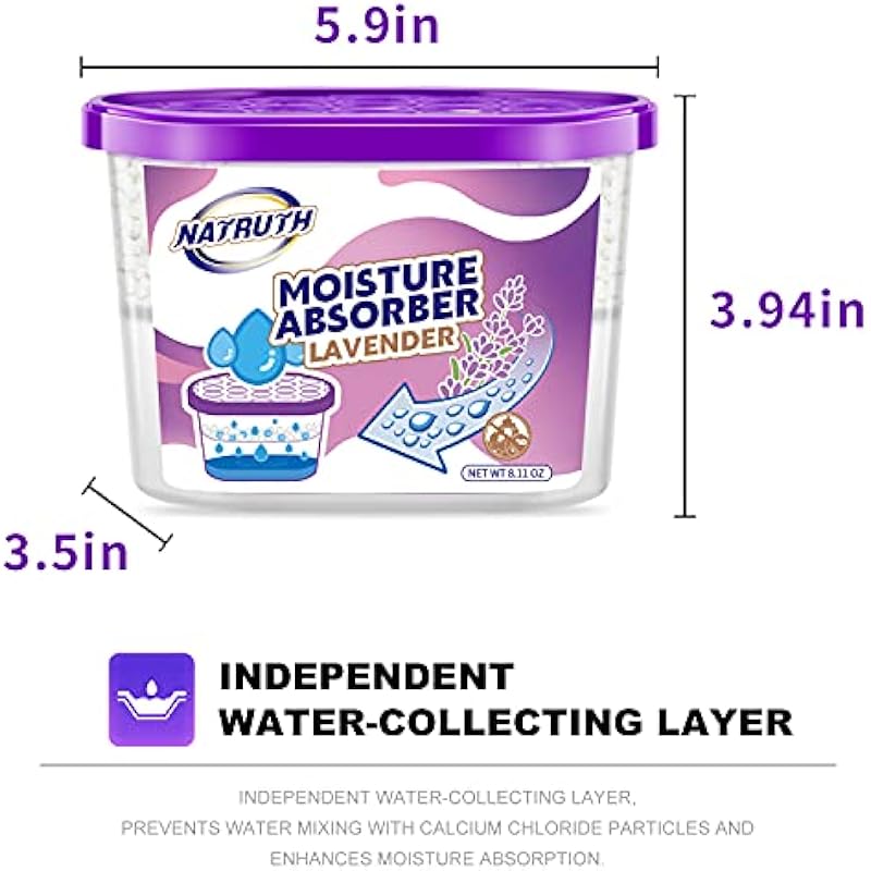 - 【REFRESH THE AIR】NATRUTH moisture removers with lavender fragrance could eliminate musty smell while releasing the pleasing fragrance at the same time. This safe moisture absorber is definitely a portable odor absorber for homes, closets, bathrooms, kitchens, laundry rooms, touring cars, shoe cabinets, boats, and closed spaces.