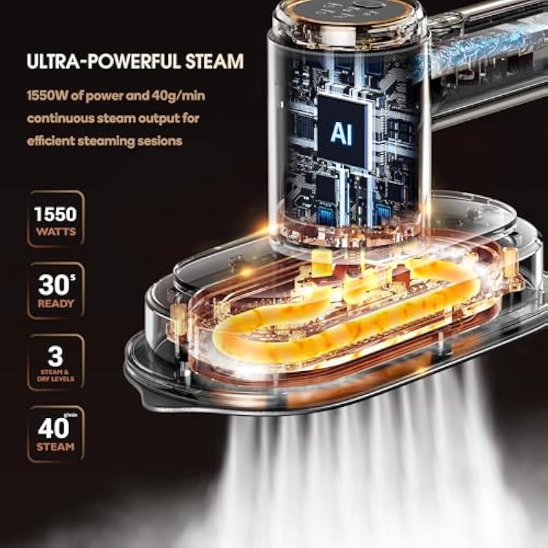 - [Pro Steamer & Iron 2-In-1] This versatile appliance excels in both horizontal and vertical ironing with a 360° anti-drip design. Use it as a steam or dry iron. The lightweight 1.7lb ergonomic handle, Diamond Ceramic Soleplate, and 90° rotational flexibility make it an indispensable household ally.