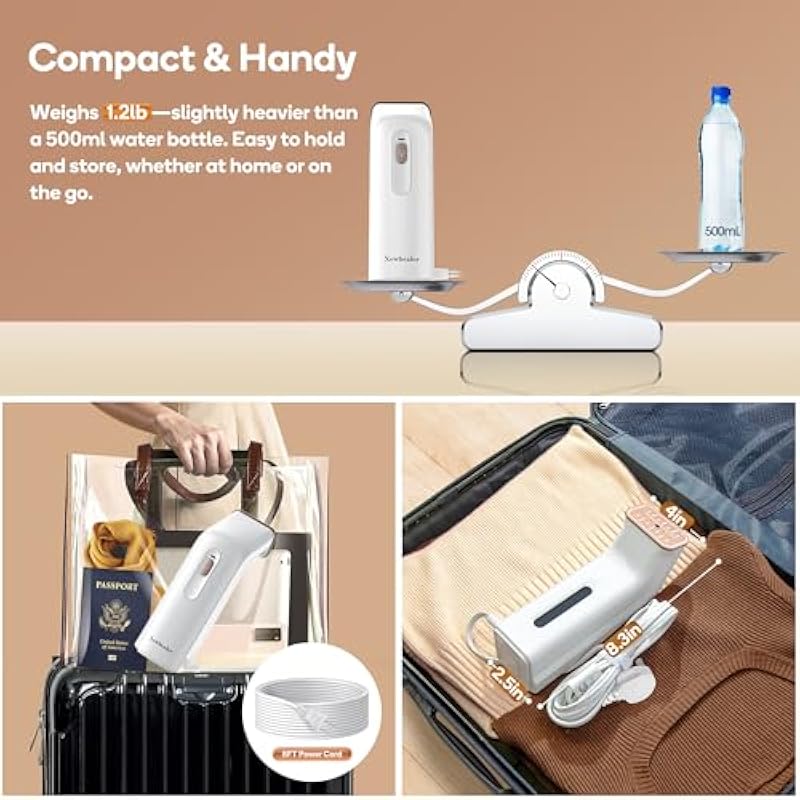 - Ideal for Delicate Fabrics: Used on lightweight materials like silk, cotton, and linen, this handheld steamer gently cares for delicate fabrics. Compact and portable (4″ x 2.5″ x 8.3″, 1.2 lbs), we consider it lightweight, though individual preferences may vary. Please evaluate based on your travel needs and comfort