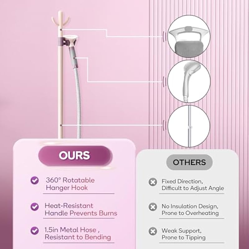 - Enhanced Safety Assurance: Designed with safety in mind, this steamer features a heater auto-off system that activates when water levels are low, ensuring confident use. The sturdy metal support rod resists bending or tipping, while the heatproof handle ensures comfort during extended use. Every component is crafted to enhance safety, providing peace of mind as you care for your garments.