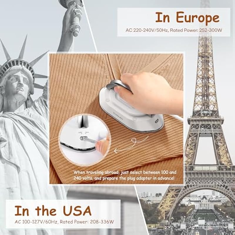 - Home & Travel: Standing Steamer(120V only)’s user-friendly design for home use. 100-240V Auto-Voltage Travel Iron removes creases from packed luggage in seconds using 300W PTC heat, balances efficiency with precise temperature control, suitable for urgent fixes during travel.