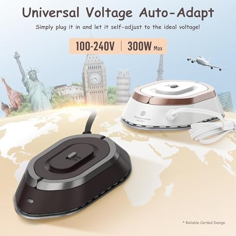 - [Version 2.0 Universal Travel Companion]: Compact and efficient, this Version 2.0 100-240V auto-voltage iron removes creases from packed luggage in seconds using 300W PTC heat. Ideal for quick touch-ups on shirts, dresses, and travel fabrics. Ultra-portable design fits carry-ons, though not for daily use or large garments. Note: A plug adapter is required for global outlets.