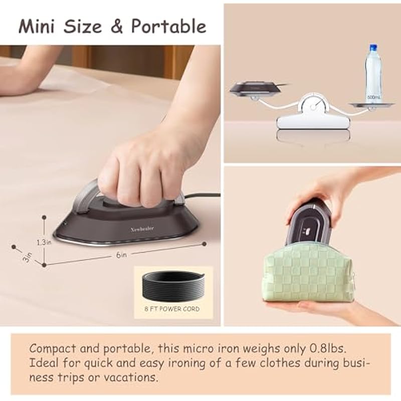 - [Multi-Scenario Essential for Travelers & Crafters]: Ideal for cruises, RVs, dorms, or quick home fixes. The NB301 travel iron includes a zippered carry bag, silicone mat, and spray bottle. Its 302°F constant temperature suits light crafting like heat transfers or DIY repairs, but not high-heat applications. Designed for travelers and busy professionals needing crisp styles on the move.