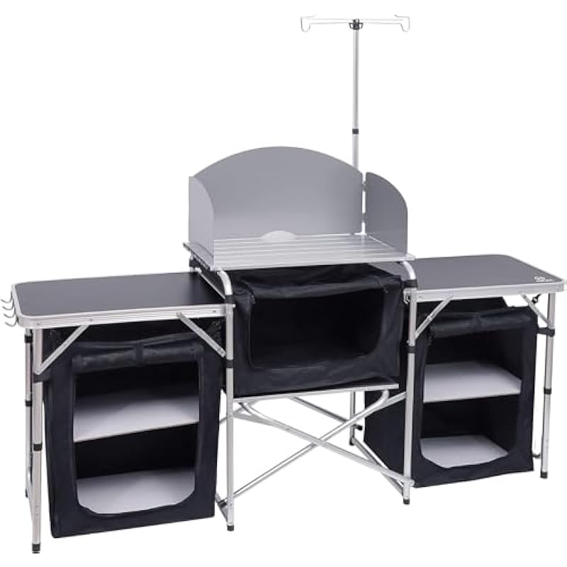 - KITCHEN STATION WITH LIGHT STAND AND WINDSHIELD: Hungry after fun? Enjoy your cooking with this all-in-1 kitchen station. No worry about the wind or light. Hang your light on the light stand and let the aluminum windshield stand for your fire.