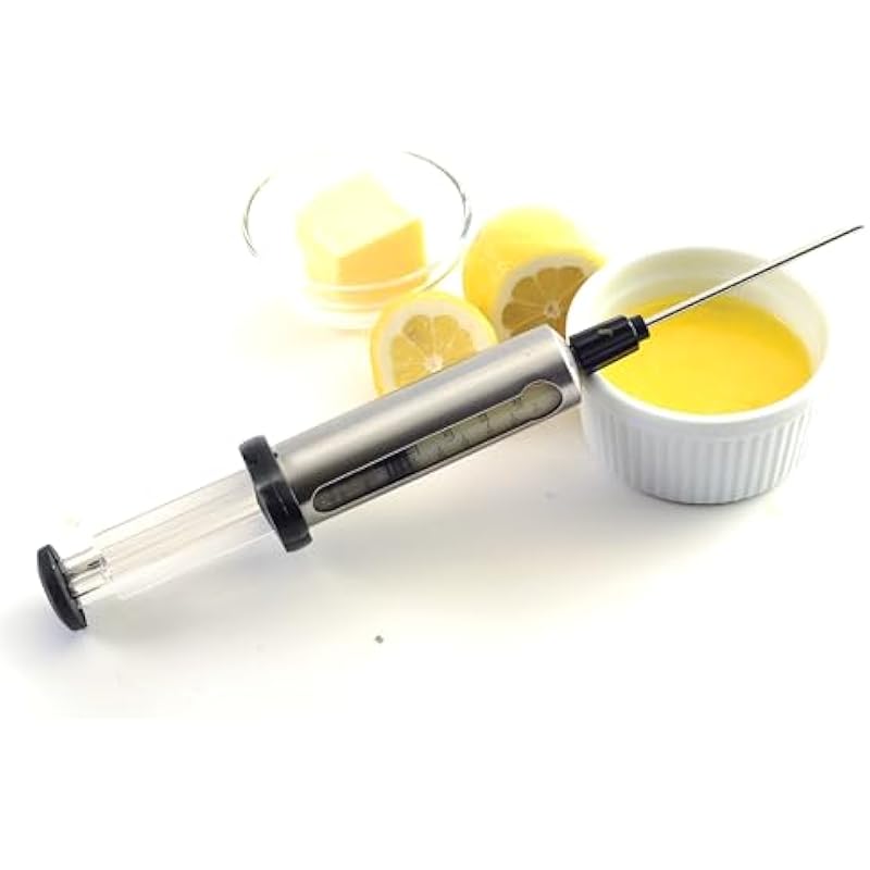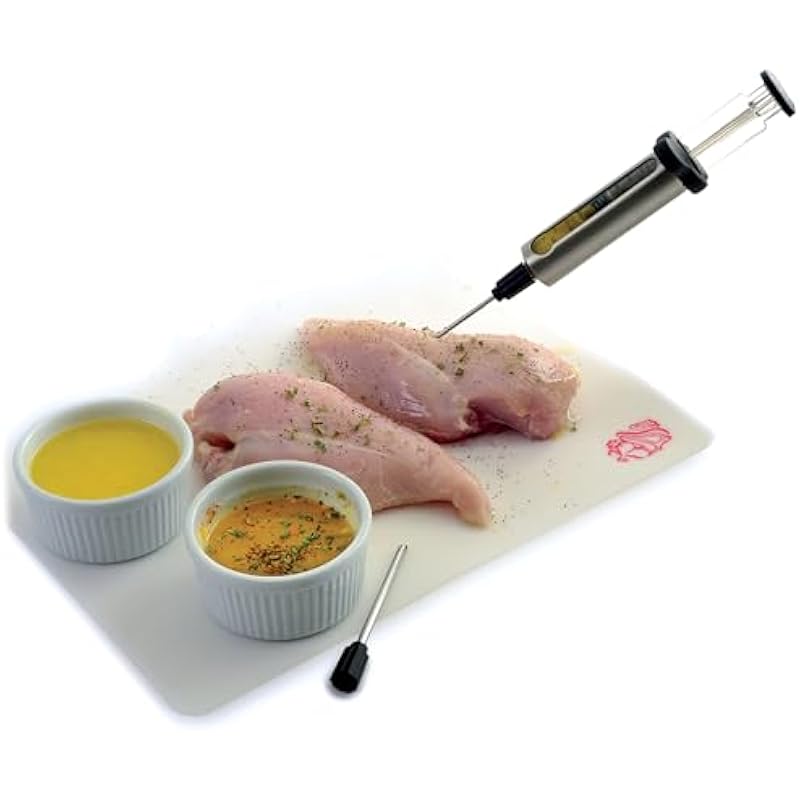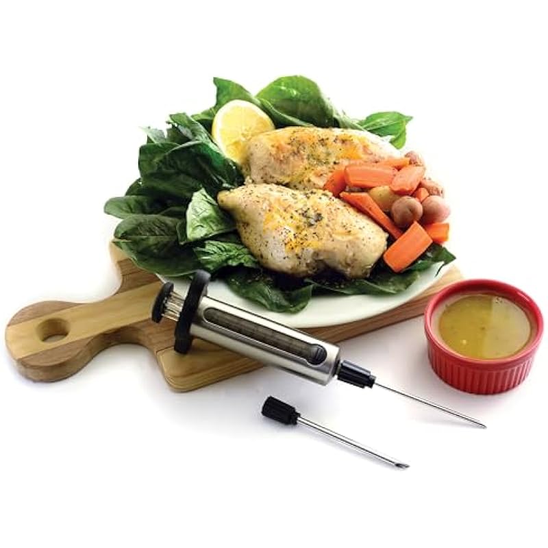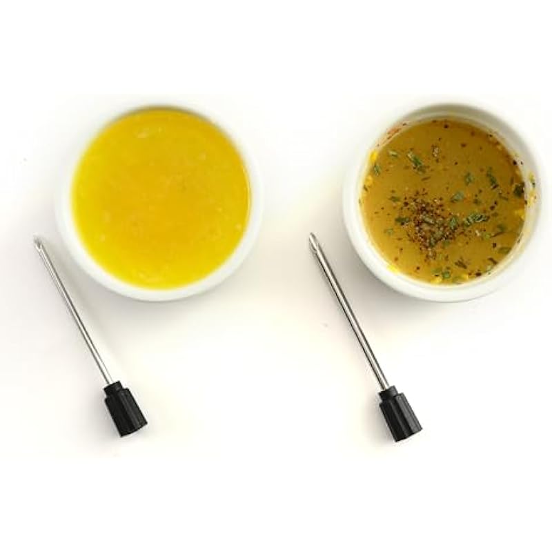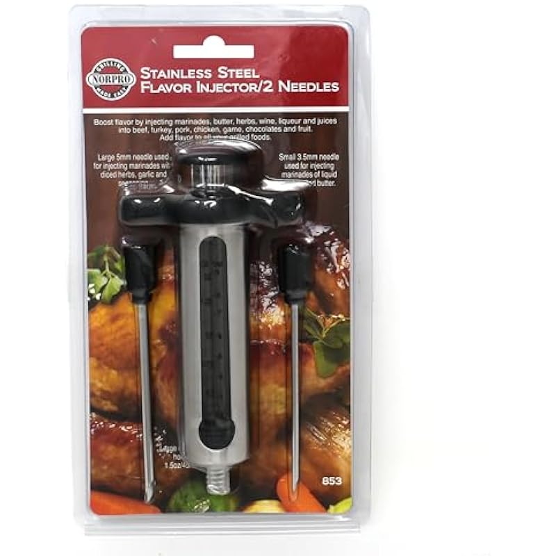 - Includes two needles: small 3.5mm needle used for injecting marinades of liquid and melted butter
