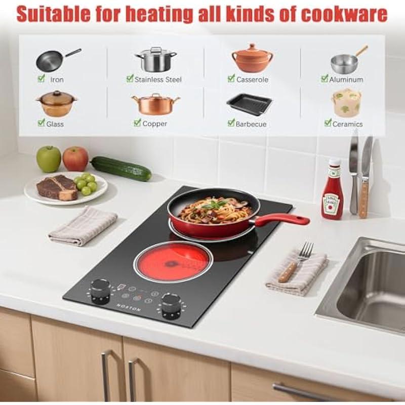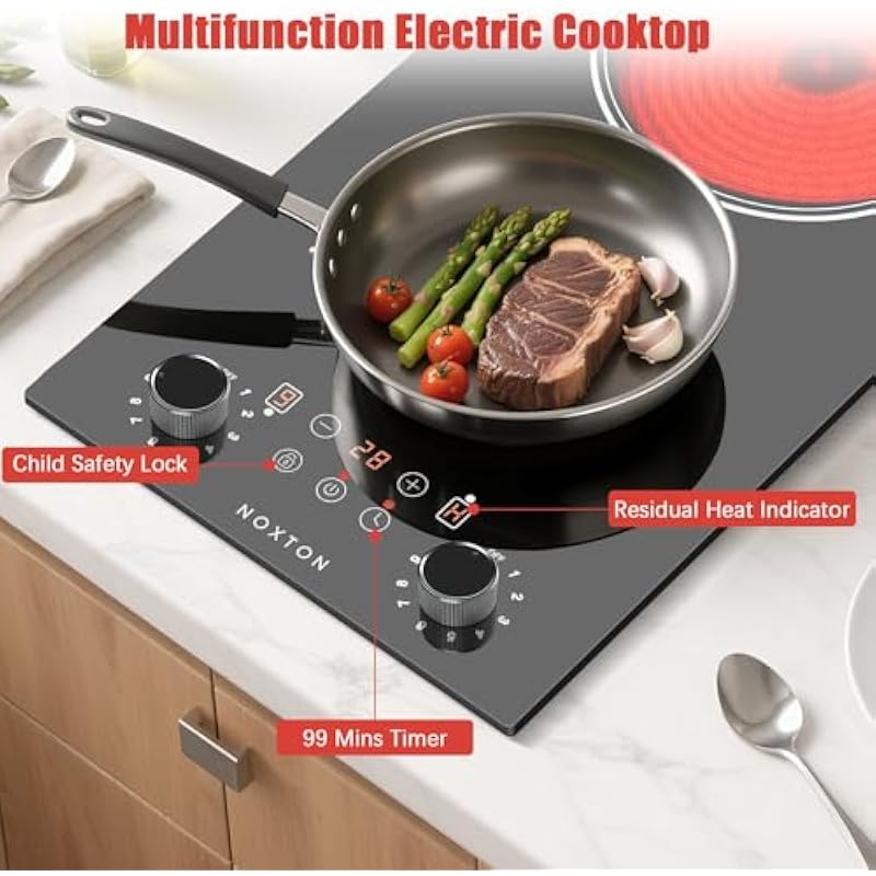 Noxton 2 Burners Electric Cooktop, 12 Inch 110V Radiant Ceramic Stove with Knob & Touch Control, 2000W Built-in or Countertop Electric Hot Plate, Timer, Child Lock, Residual Heat Indicator(BW)