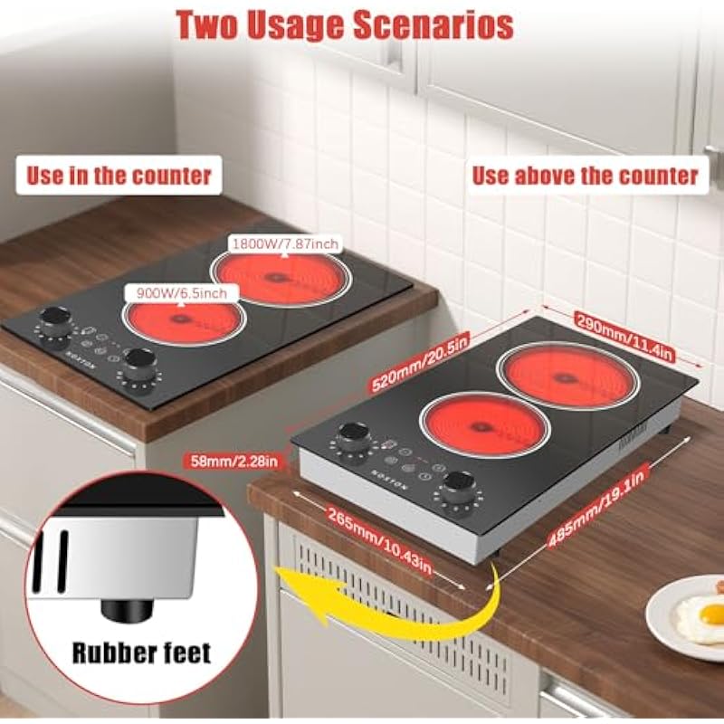 - 【2 Burners with 9 Power Levels, 2000W Total】 This 2 burners electric cooktop features one 1800W (7.87″) and one 900W (6.5″) radiant burner. The total output is limited to 2000W for safety. When using both burners simultaneously, power is intelligently shared (e.g. 1800W + 200W or 1100W + 900W), ensuring safe and efficient cooking.