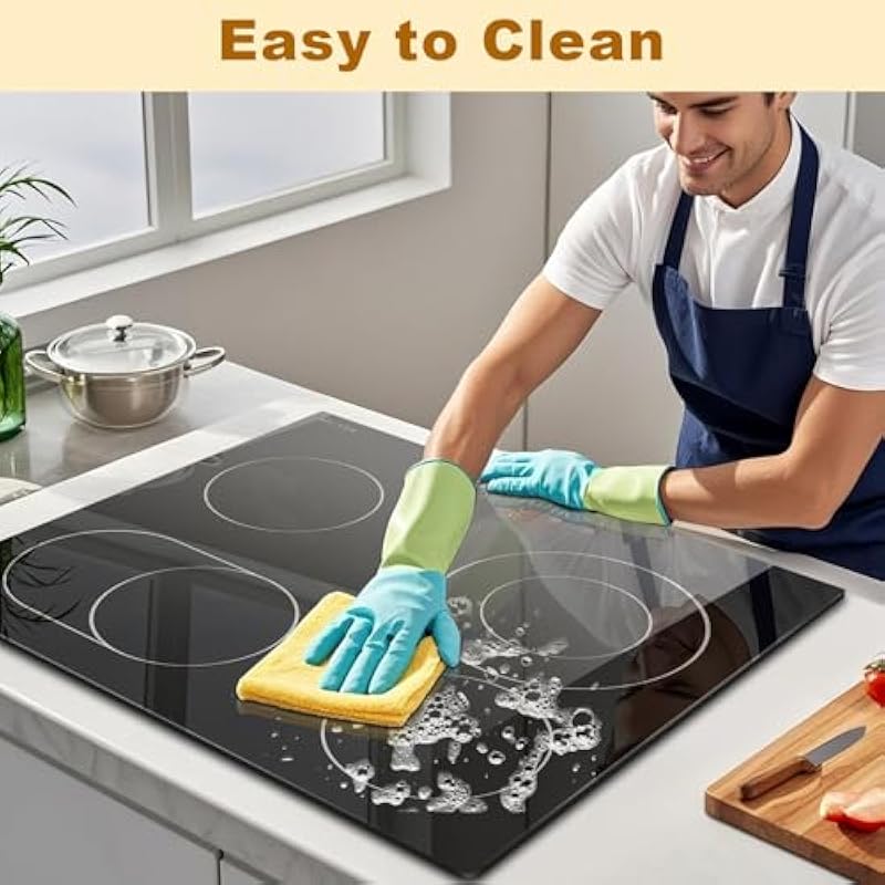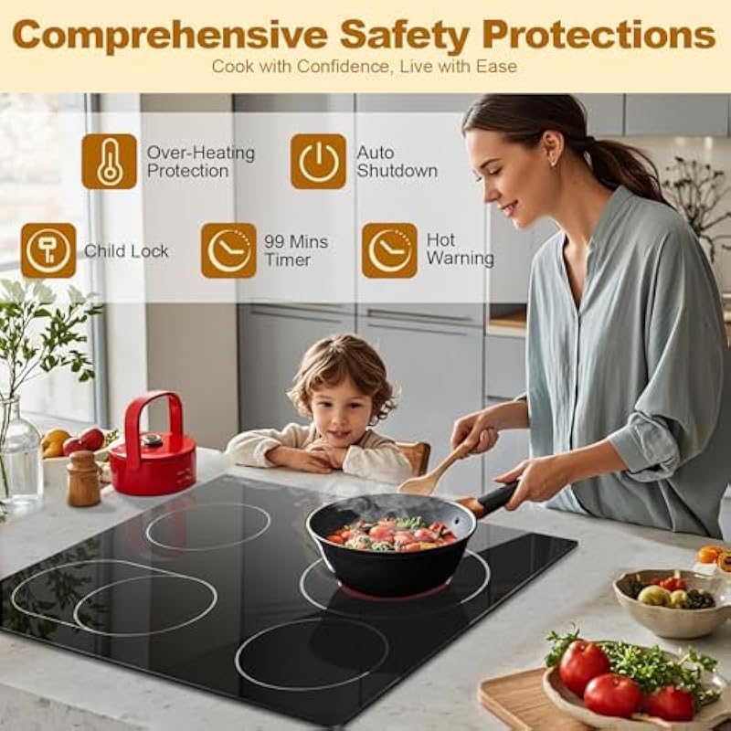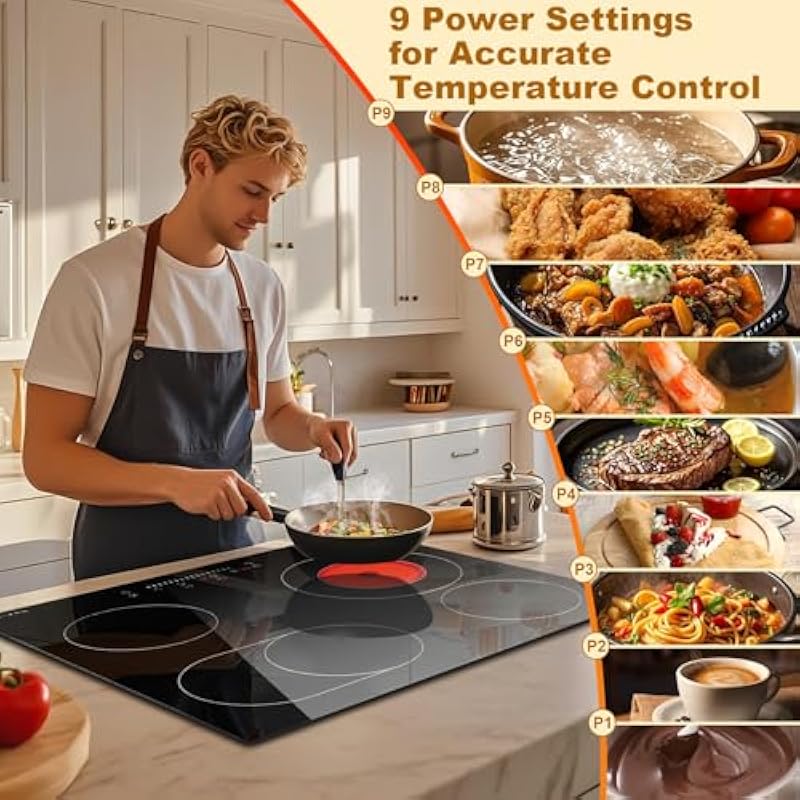 - 【All-in-One Functionality】This 4 burners electric cooktop isn’t just about looks—it’s packed with features to support your cooking. From a 99-minute timer to a child safety lock, booster function, and extendable griddle burner, it offers all the versatility you need. With 9 power levels, it adapts to various cooking styles, ensuring every ingredient is cooked to perfection, every time.