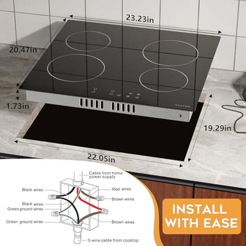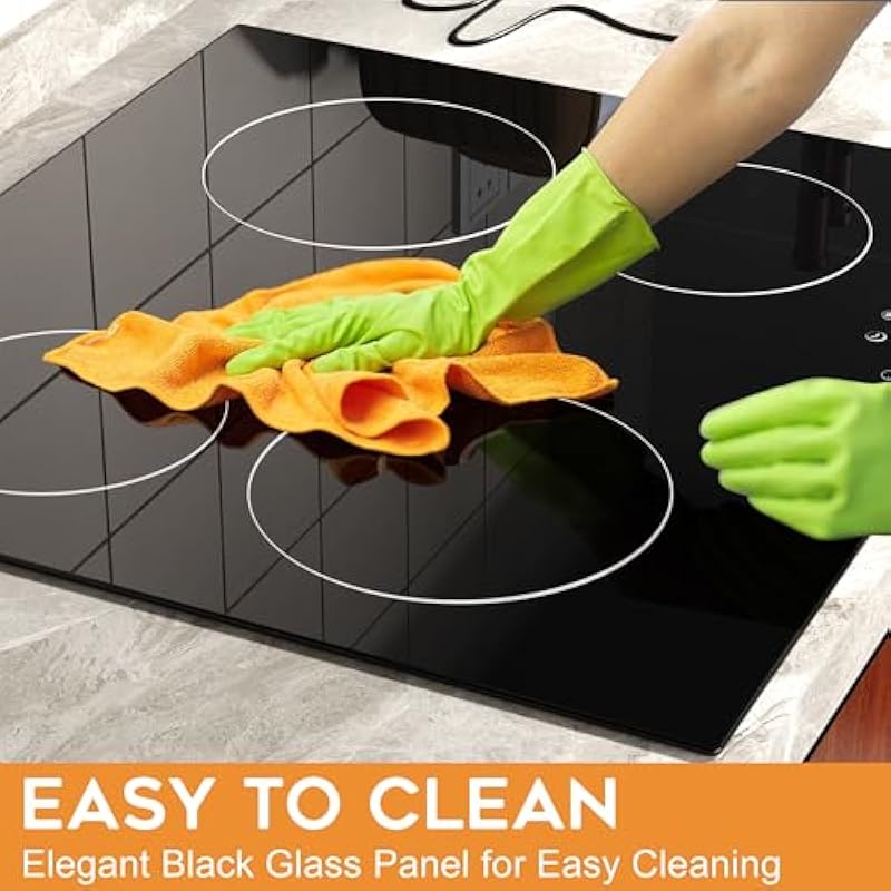 - 【Safe 4 Burners Electric Cooktop 】The 24” electric cooktop provides a series of safety features, such as Child Safety Lock, which prevents children from touching indiscriminately; High Temperature Warning, which alerts users that the glass surface is hot; Overheating protection function, which automatically shuts down if the 240V electric cooktop detects an abnormal internal temperature; Electric ceramic cooktop has no electromagnetic radiation, so pregnant women can also use it without worry.