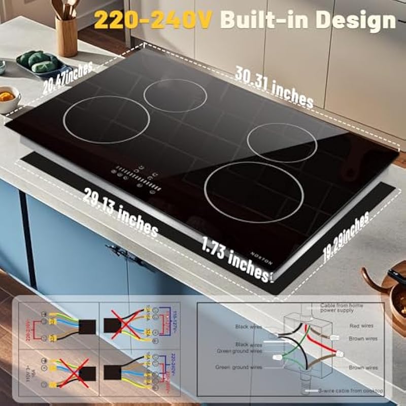 - 【7200W 220~240V Induction Cooktop】 Noxton 30 inch induction stovetop does a great job in cuisine, from simmering to boiling, meeting all cooking needs. It is a 7200W high – power induction cooktop 4 burners whose rated voltage is 220 – 240V. Due to the use of high voltage, the 24″ induction cooktop does not have a plug and needs to be hard – wired to 220~240V.