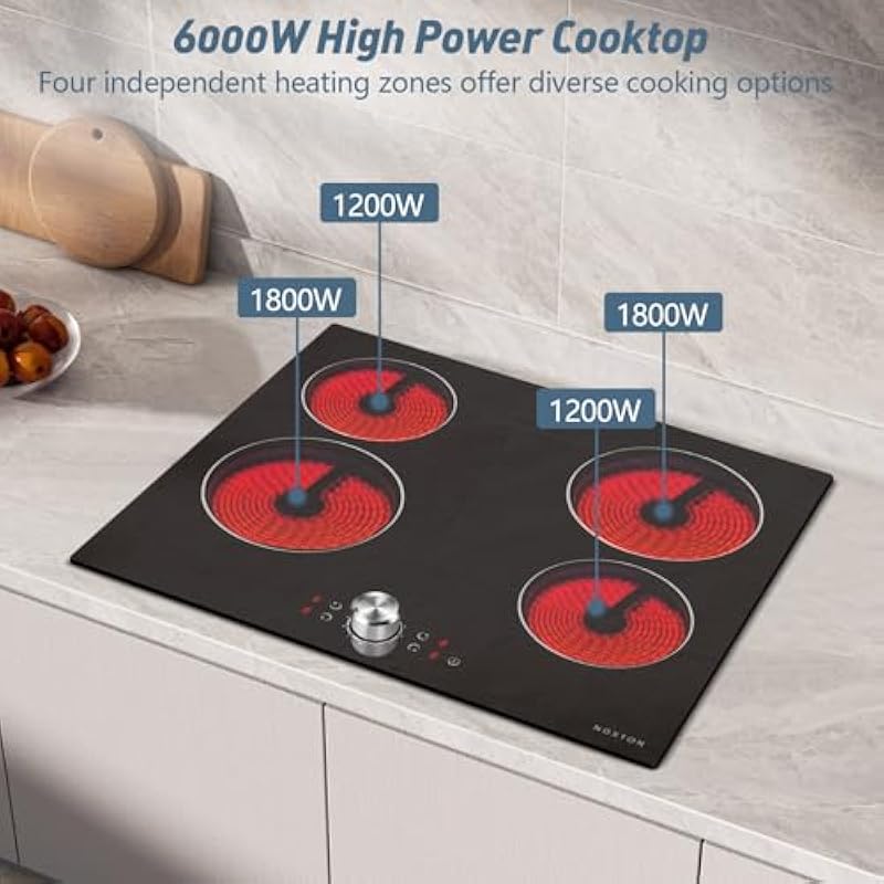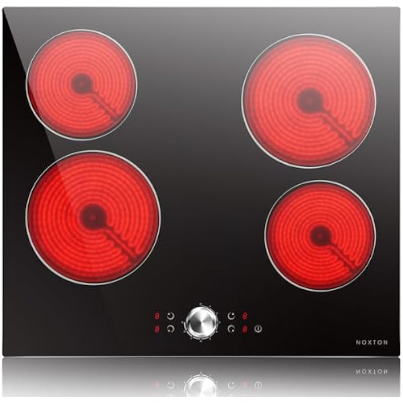 Noxton Electric Cooktop 24 Inch, Knob Control 4 Burners Electric Stovetop, Built-in Radiant Ceramic Stove, Residual Heat Indicator, Overheating protection, 6000W 220-240V Hard Wired (No Plug)