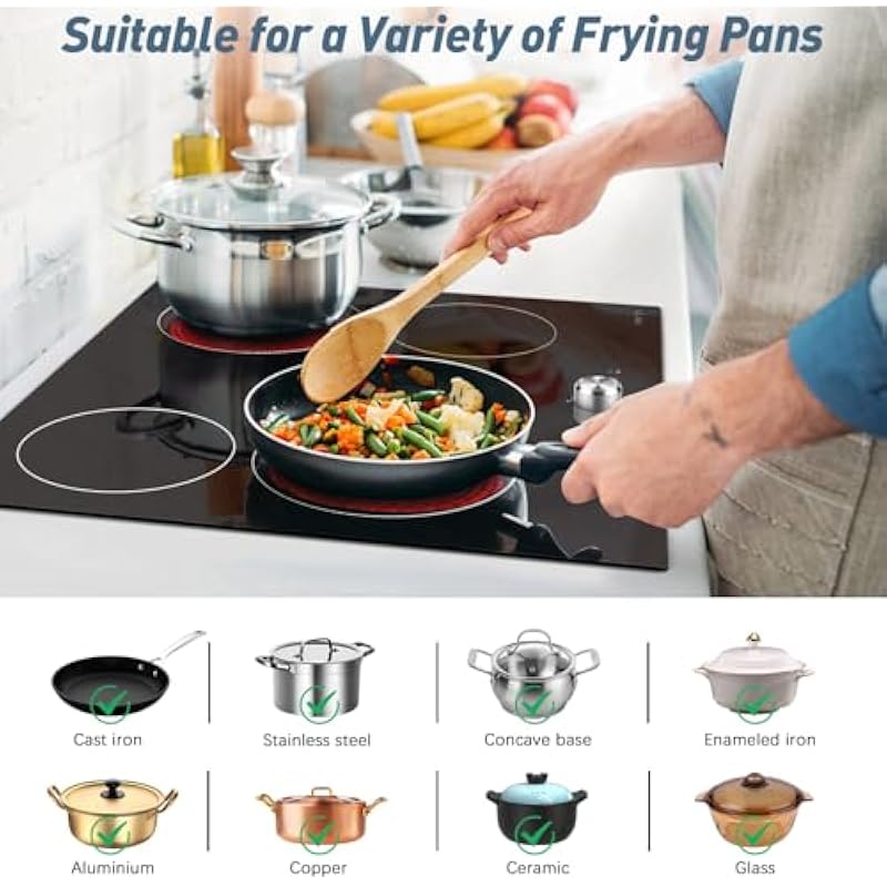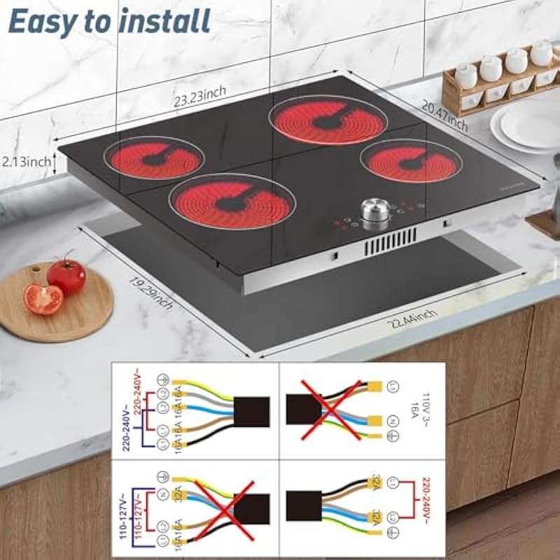 - 【220-240V Built-in Electric Cooktop 6000W】 To provide rapid heating, the 4 burner electric ceramic cooktop outputs a high power of up to 6000W. For this performance, it requires a 220-240V power supply connection; please note that it does not come with a plug. Lower-powered alternatives heat more slowly, making this high-power option a superior choice for those seeking quick and effective cooking solutions.