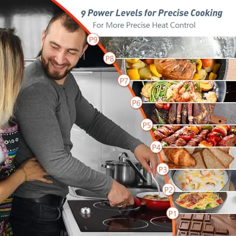 - 【9 Power Level Settings & 6000W High Power Electric Cooktop】 Equipped with four burners, this 4 burners electric cooktop delivers up to 6000 watts of power, heating up faster than many other models on the market. The 9 adjustable power levels, ranging from 1200W to 1800W per burner, ensure you can find the perfect setting for various cooking techniques, while allowing all four burners to operate simultaneously for efficient meal preparation.