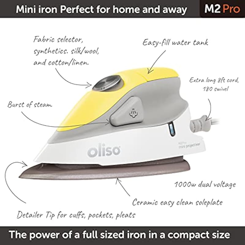 - TRAVEL READY: Versatility and power: Lightweight design perfect for travel, quilting, and sewing. With 1000 watts and dual voltage for worldwide use, the oliso Project Iron heats up in just 45 seconds. A push of the button releases a burst of steam to eliminate wrinkles or press crisp seams with precision. Features an 8-ft, 180° pivoting cord for hassle-free use.