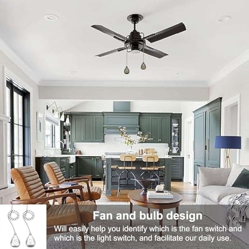 - With the pattern design of the fan and light bulb, the ceiling fan pull chain can easily help you identify which switch is for fan and light, making it convenient for our daily use. Comes with a connector. The length is suitable and can be reached by raising your hand, making it easy to find the switch. The ceiling fan pull chain is made of good quality metal, which is heavy enough and will not shake in the wind. It is sturdy and resistant to falling, rust-proof, and has a long service life.