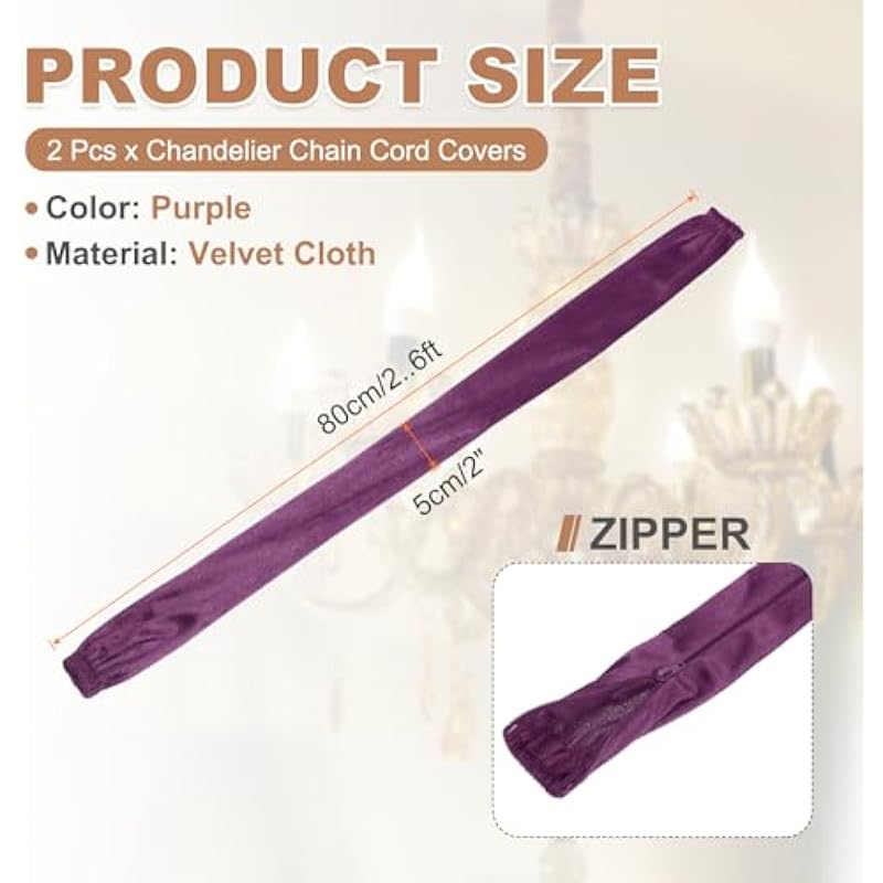 - Specification: Color: Purple; Material: Velvet Cloth; Size: 80 x 5cm / 2.6ft x 2inch (L*W); Style: Zipper; Packing List: 2 x Chandelier Chain Cord Covers