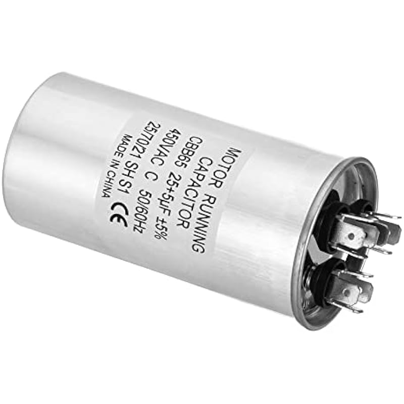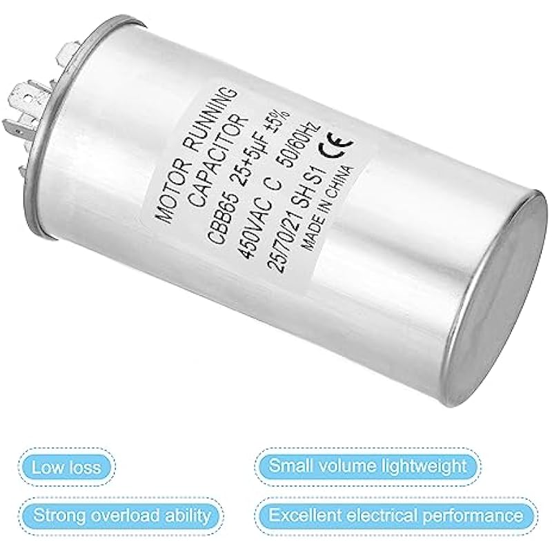 - Specification:Model: CBB65;Material: Metallized Polypropylene, Aluminum Case;Lead End: 3 Terminal(4+4+4pins);Rated Capacity: 25+5uf;Tolerance: ±5%;Rated Voltage: 450VAC;Rated Frequency: 50/60Hz;Climatic Category: 25/70/21;Overall Size: 50 x 100mm/1.95 x 3.9inch (D x H); Package Includes: 1Pcs x CBB65 Capacitor