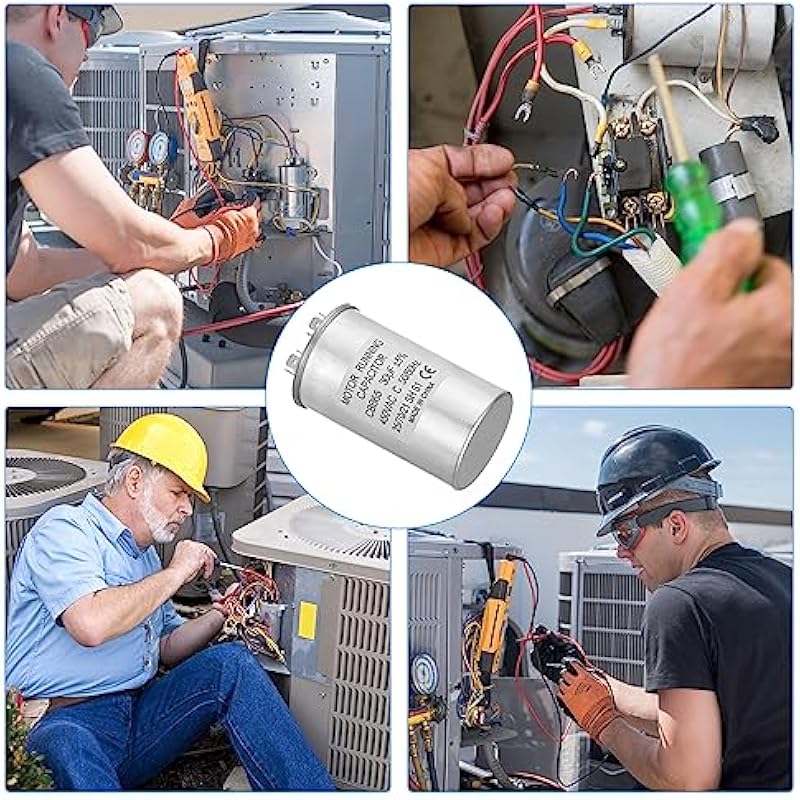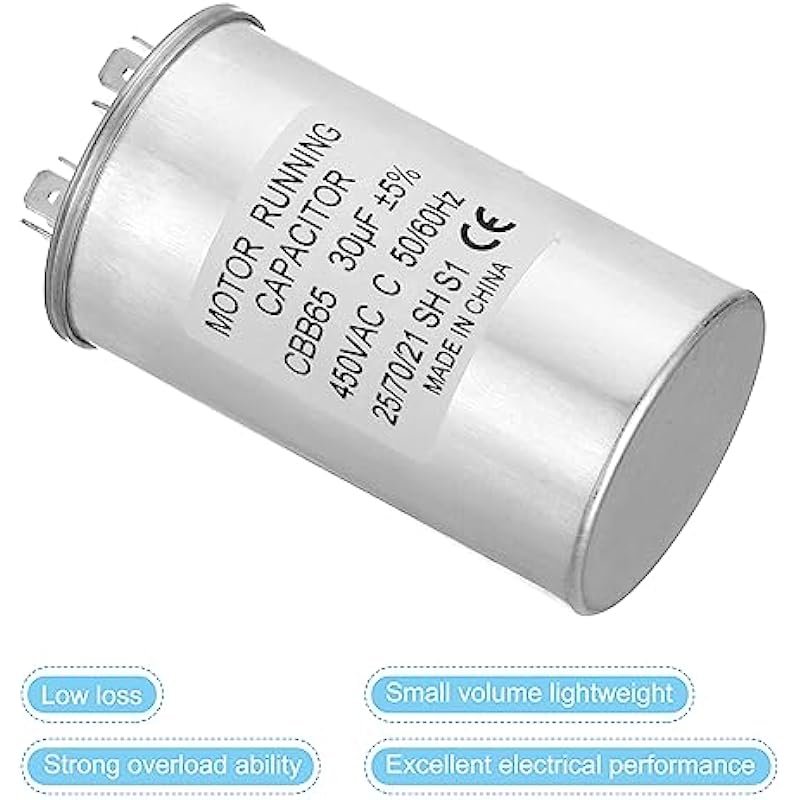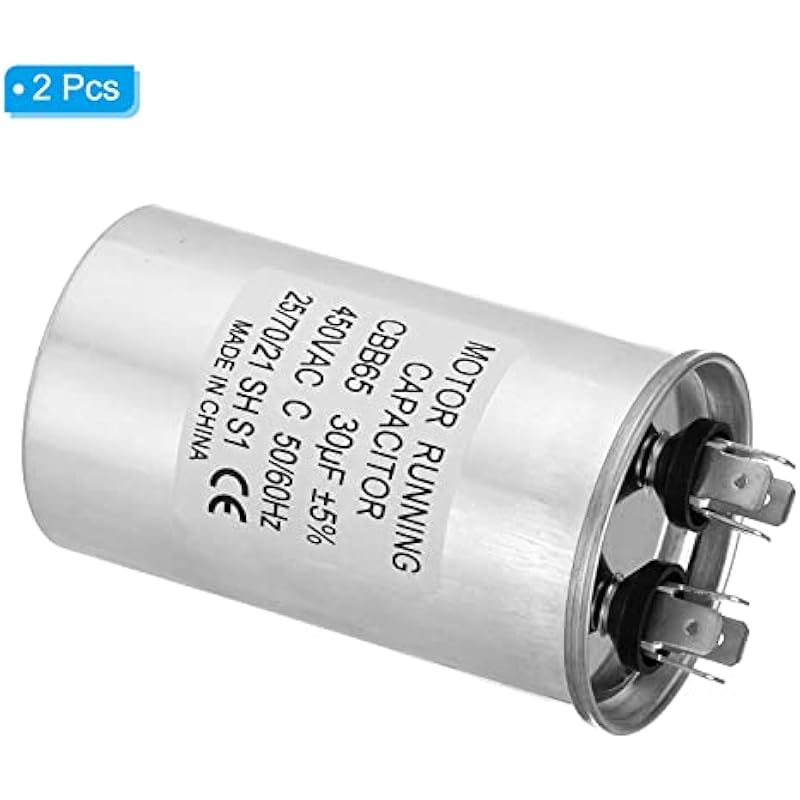 - Specification:Model: CBB65;Material: Metallized Polypropylene, Aluminum Case;Lead End: 2 Terminal(4+4pins);Rated Capacity: 30uf;Tolerance: ±5%;Rated Voltage: 450VAC;Rated Frequency: 50/60Hz;Climatic Category: 25/70/21;Overall Size: 50 x 85mm/1.95 x 3.32inch (D x H); Package Includes: 2Pcs x CBB65 Capacitor