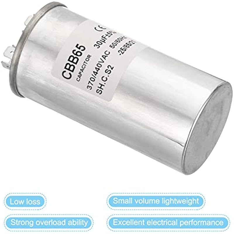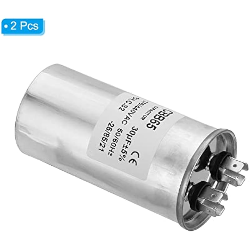 - Specification:Model: CBB65;Material: Metallized Polypropylene, Aluminum Case;Lead End: 2 Terminal (8 pins);Rated Capacity: 30uF;Tolerance: ±5%;Rated Voltage: 370/440V AC;Rated Frequency: 50/60Hz;Climatic Category: -25/85/21;Overall Size: 50 x 100mm/1.95 x 3.9inch (D x H); Package Includes: 2 x CBB65 Capacitor