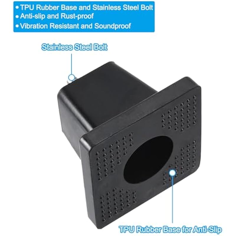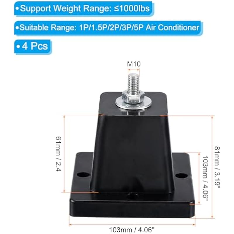 - Specification: Material: TPU Rubber, Stainless Steel; Color: Black; Bolt Thread Size: M10, 25mm/0.98inches; Base Size: 103x103mm/4.06×4.06inches(LxW); Height: 81mm/3.19inches; Height (Without Base): 61mm/2.4inches; Support Weight Range: ≤1000lbs; Suitable Range: 1P/1.5P/2P/3P/5P Air Conditioner; Package List: 4Pcs x Mounting Rubber Pads Bracket