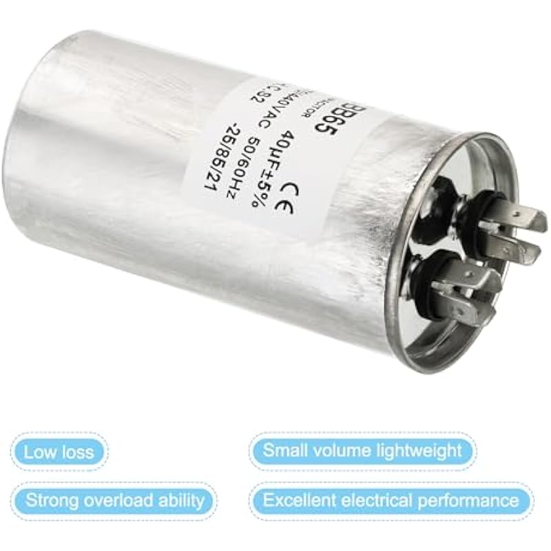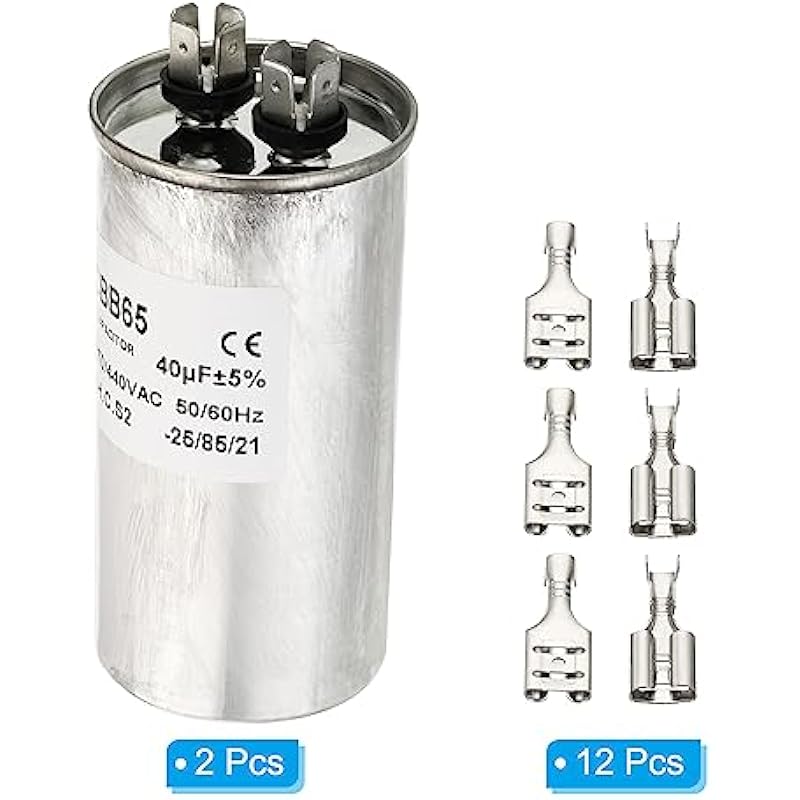 - Specification:Model: CBB65;Material: Metallized Polypropylene, Aluminum Case;Lead End: 2 Terminal( 8Pins );Rated Capacity: 40uf;Tolerance: ±5%;Rated Voltage: 370/440V AC;Rated Frequency: 50/60Hz;Climatic Category: -25/85/21℃;Overall Size: 50 x 100mm/1.95 x 3.9inch(D x H); Package Includes: 2Pcs x CBB65 Capacitor