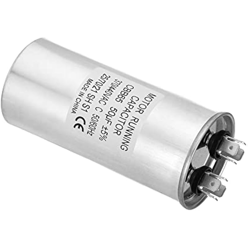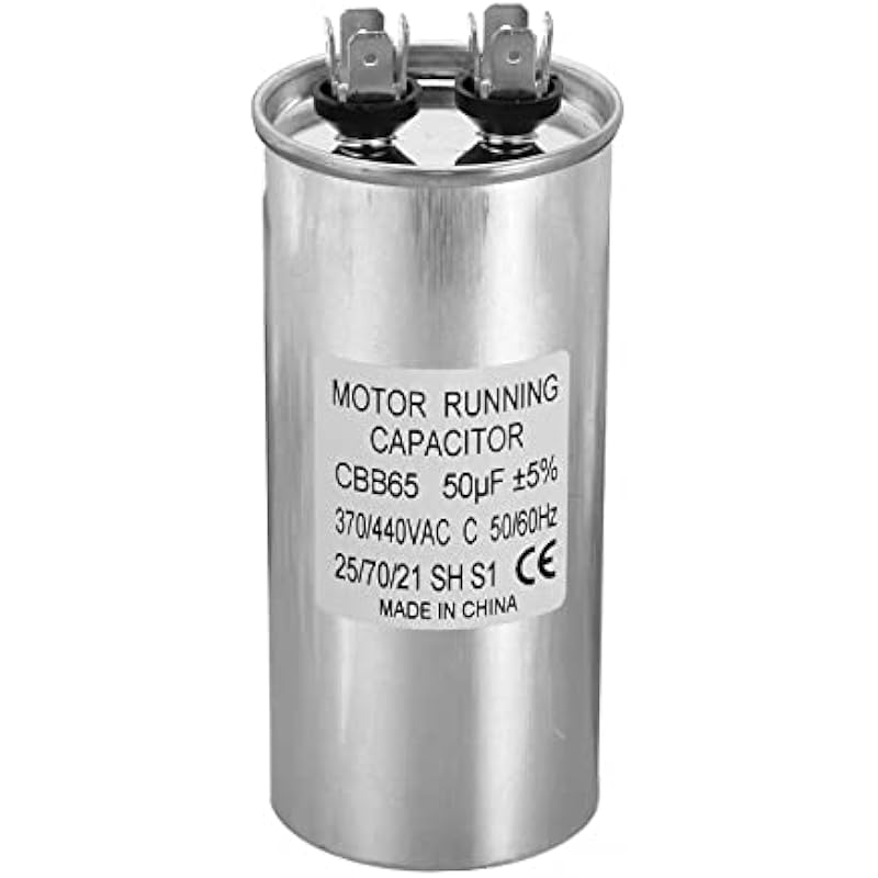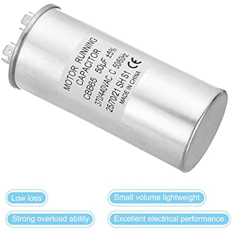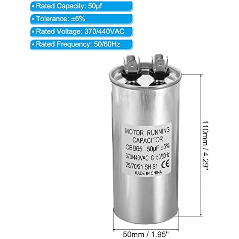 - Specification:Model: CBB65;Material: Metallized Polypropylene, Aluminum Case;Lead End: 2 Terminal(4+4pins);Rated Capacity: 50uf;Tolerance: ±5%;Rated Voltage: 370/440VAC;Rated Frequency: 50/60Hz;Climatic Category: 25/70/21;Overall Size: 50 x 110mm/1.95 x 4.29inch (D x H); Package Includes: 1Pcs x CBB65 Capacitor