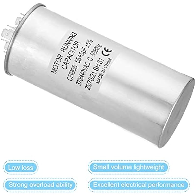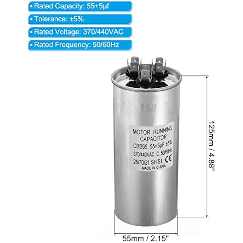 - Specification:Model: CBB65;Material: Metallized Polypropylene, Aluminum Case;Lead End: 3 Terminal(4+4+4pins);Rated Capacity: 55+5uf;Tolerance: ±5%;Rated Voltage: 370/440VAC;Rated Frequency: 50/60Hz;Climatic Category: 25/70/21;Overall Size: 55 x 125mm/2.15 x 4.88inch (D x H); Package Includes: 1Pcs x CBB65 Capacitor