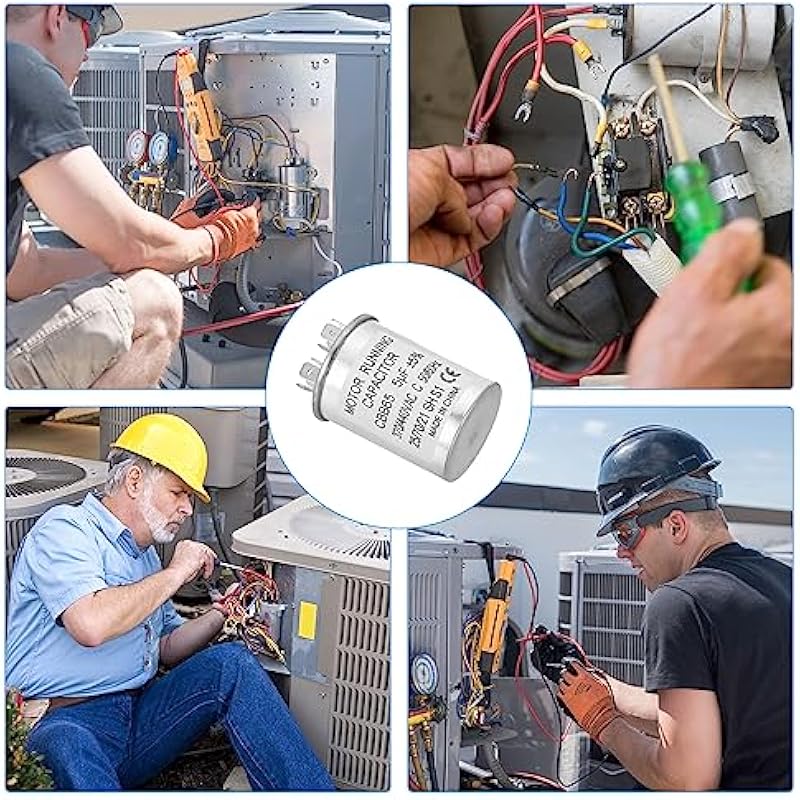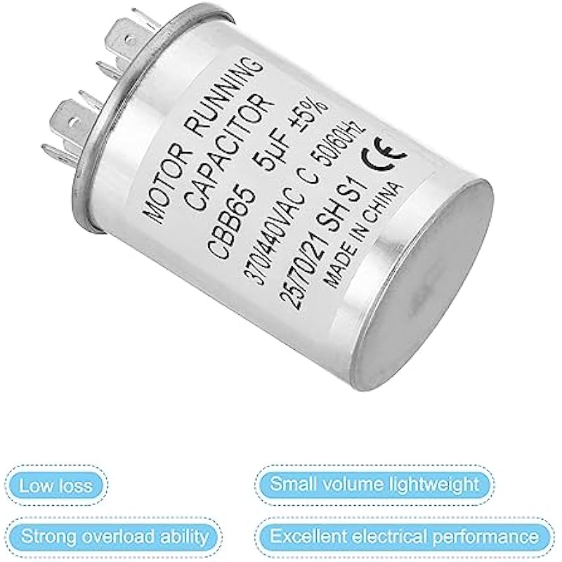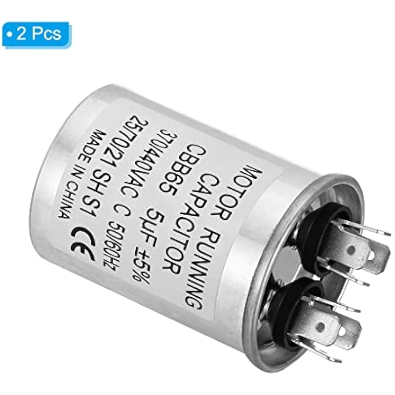 - Specification:Model: CBB65;Material: Metallized Polypropylene, Aluminum Case;Lead End: 2 Terminal(4+4pins);Rated Capacity: 5uf;Tolerance: ±5%;Rated Voltage: 370/440VAC;Rated Frequency: 50/60Hz;Climatic Category: 25/70/21;Overall Size: 40 x 55mm/1.56 x 2.15inch (D x H); Package Includes: 2Pcs x CBB65 Capacitor