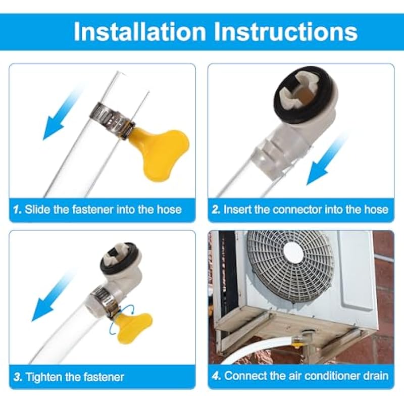 - Easy to install, fix the drain connector to the drain outlet of AC, and connect the other end to the drain hose with the clamp.