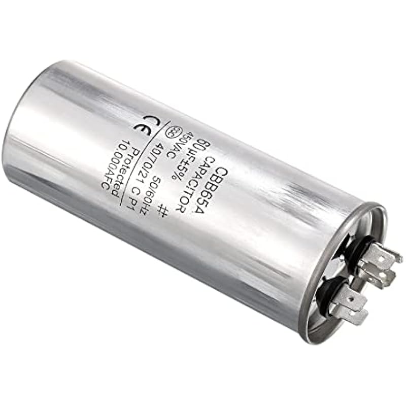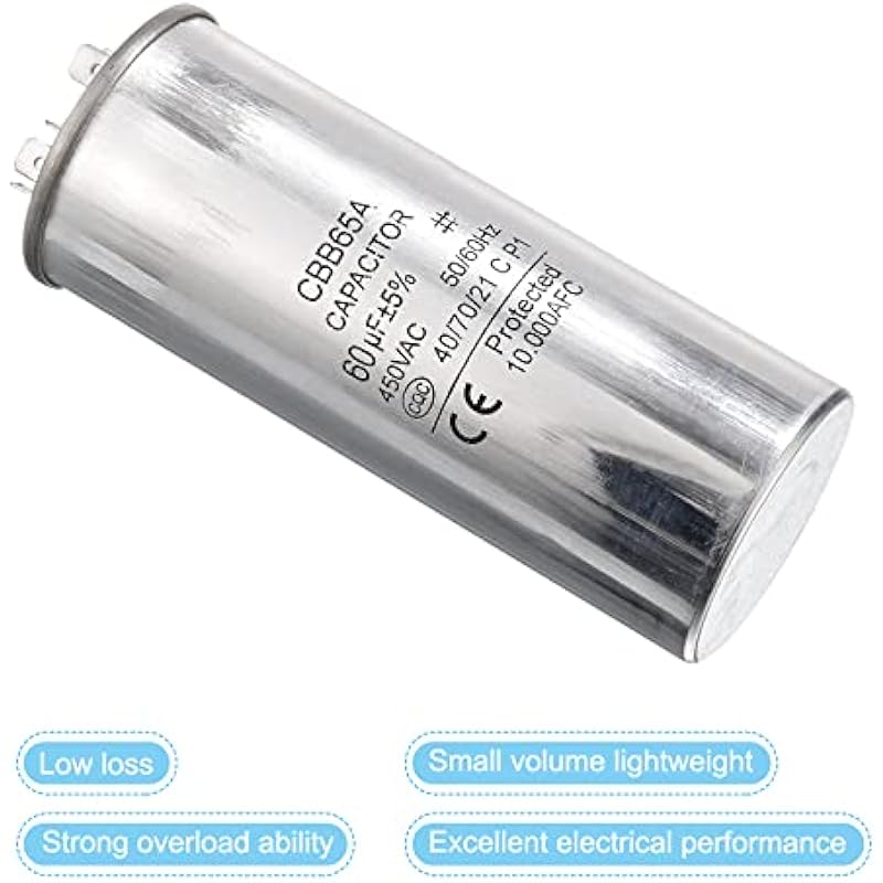 - Model: CBB65;Material: Metallized Polypropylene, Aluminum Case;Lead End:2 Terminal (6 pins);Rated Capacity: 60uf;Tolerance: ±5%;Rated Voltage: 450V AC;Rated Frequency: 50/60Hz;Climatic Category: 40/70/21;Overall Size: 1.95 x 4.88inch(D x H); Package Includes: 1Pcs x CBB65 Capacitor