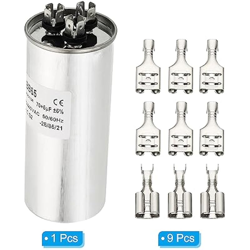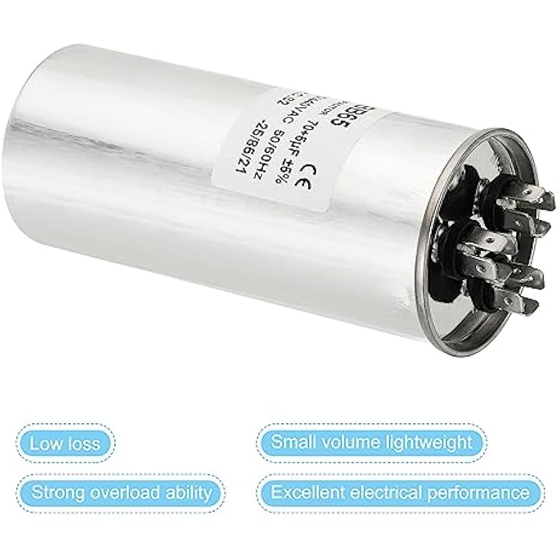 - Specification:Model: CBB65;Material: Metallized Polypropylene, Aluminum Case;Lead End: 3 Terminal( 12Pins );Rated Capacity: 70+5uf;Tolerance: ±5%;Rated Voltage: 370/440V AC;Rated Frequency: 50/60Hz;Climatic Category: -25/85/21℃;Overall Size: 55 x 130mm/2.14 x 5.07inch(D x H); Package Includes: 1Pcs x CBB65 Capacitor