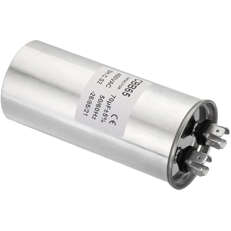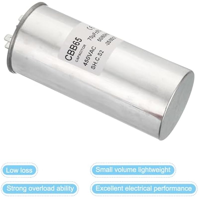 - Specification:Model: CBB65;Material: Metallized Polypropylene, Aluminum Case;Lead End: 2 Terminal (8Pins);Rated Capacity: 70uF;Tolerance: ±5%;Rated Voltage: 450V AC;Rated Frequency: 50/60Hz;Climatic Category: -25/85/21;Overall Size: 55 x 125mm/2.15 x 4.88inch (D x H); Package Includes: 1 x CBB65 Capacitor