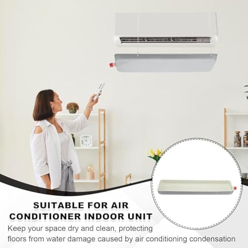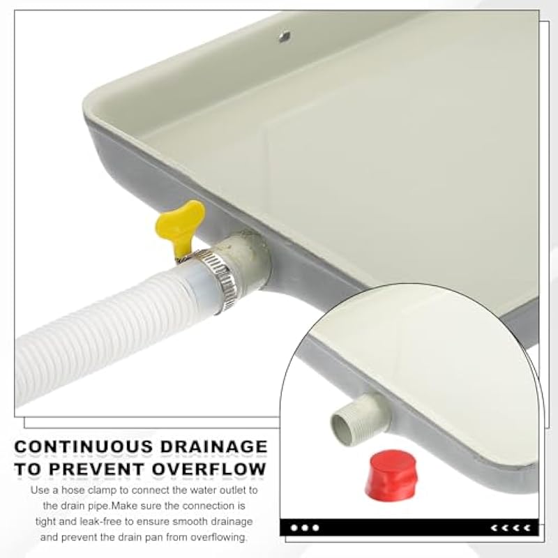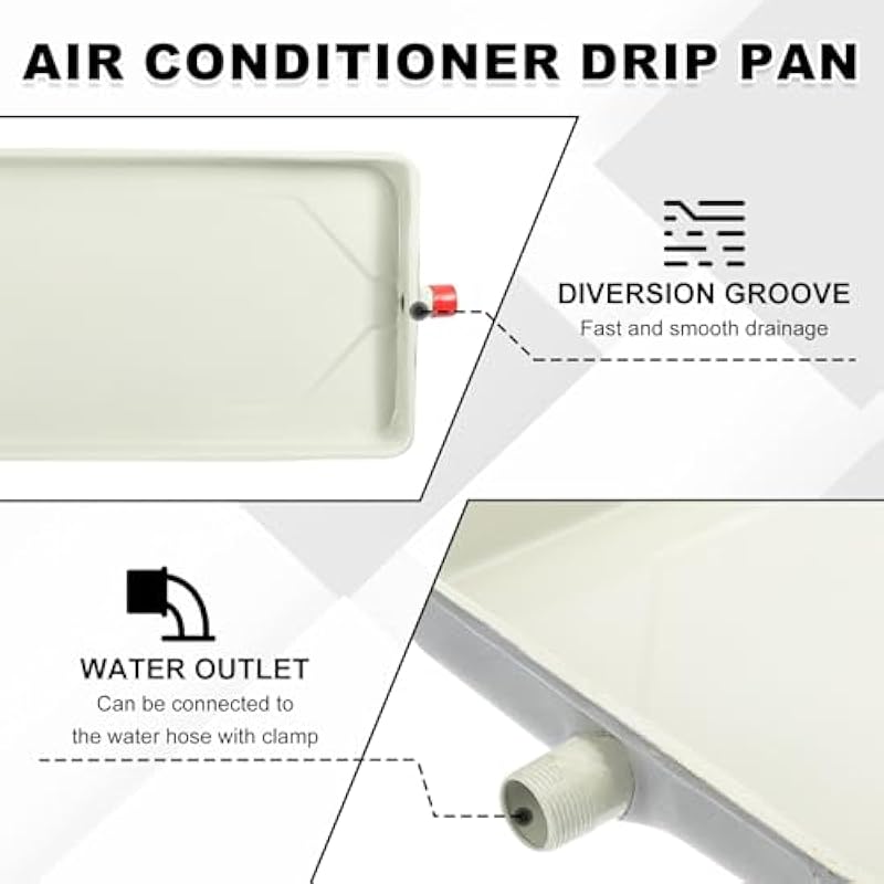 - Application: Keep your space dry and clean with our Air Conditioner Drip Tray, designed to protect floors from water damage caused by AC condensation. The included drain hole and hose allow for continuous drainage to prevent overflow. The collected water can be used to water plants and flowers. Works with split AC, portable/window units, fan coil unit, dehumidifier, and water heaters. Suitable for bedroom, kitchen, dining room, office, etc.