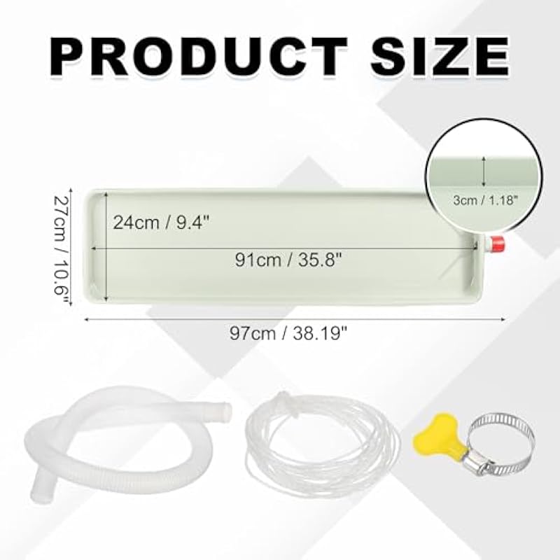 - Internal Size: 91 x 24 x 3 cm / 35.8 x 9.4 x 1.18 inch (L*W*H); Total Size: 97 x 27 x 4.5 cm / 38.19 x 10.63 x 1.77 inch (L*W*H); Packing List: 1 x Air Conditioner Drip Pan, 1 x Hanging Rope, 1 x Water Hose, 1 x Hose Clamp