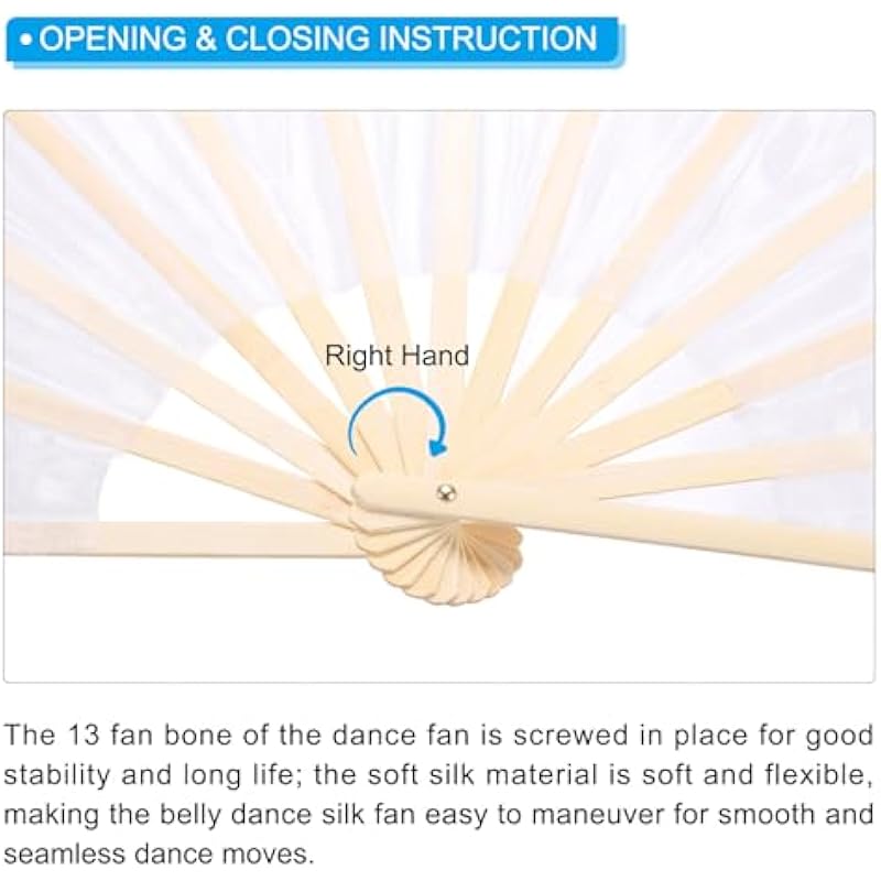 - Advantage: The 13 fan bone of the dance fan are screwed in place for good stability and long life; the soft silk material is soft and flexible, making the belly dance silk fan easy to maneuver for smooth and seamless dance moves.