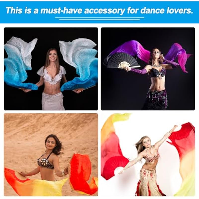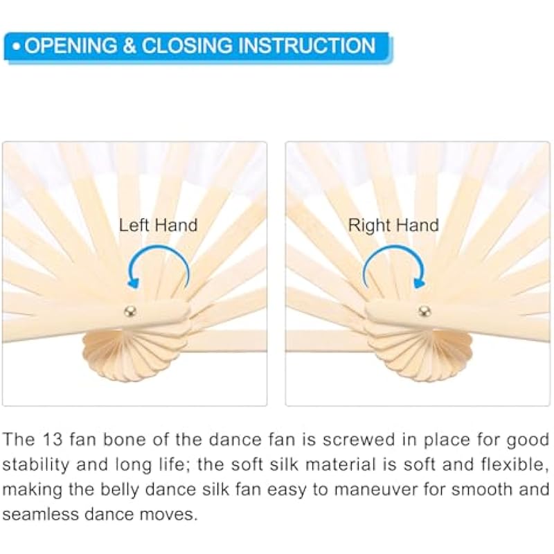 - Advantage: The 13 fan bone of the dance fan are screwed in place for good stability and long life; the soft silk material is soft and flexible, making the belly dance silk fan easy to maneuver for smooth and seamless dance moves.