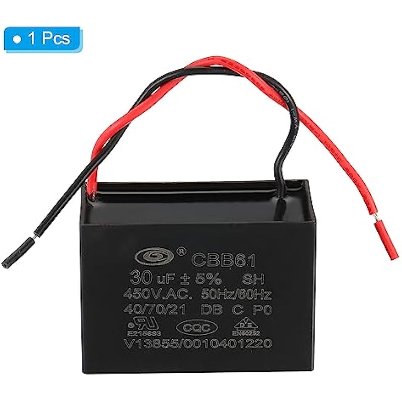 - Model: CBB61; Material: Polypropylene Film Plastic Shell; Terminal: 2 Wires; Tolerance: ±5%; Rated Capacity: 30uF; Climatic Category: 40/70/21; Body Size:65 x 45 x 45mm/2.54 x 1.76 x 1.76 inch(L x W x H); Wire Length:13cm/5.07inch; Shell Color: Black; Rated Voltage: 450V AC; Rated Frequency:50/60Hz; Pack of 1Pcs CBB61 Capacitor