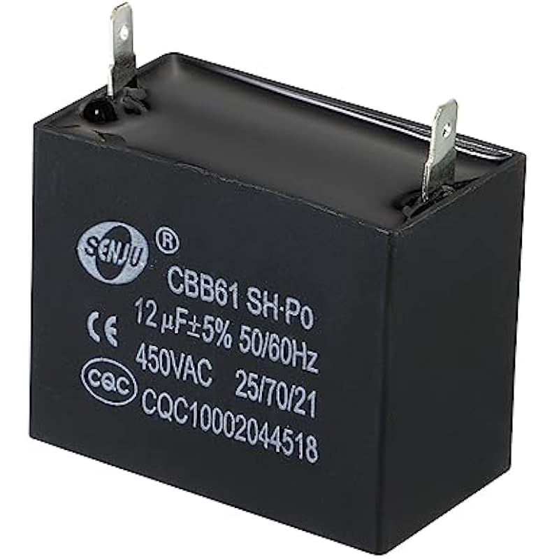 - Model: CBB61; Material: Polypropylene Film Plastic Shell; Terminal: 2pins; Tolerance: ±5%; Rated Capacity: 12uF; Climatic Category: 25/70/21; Body Size:49 x 41 x 39mm/1.91 x 1.6 x 1.52 inch(L x W x H); Wire Length:; Shell Color: Black; Rated Voltage: 450V AC; Rated Frequency:50/60Hz; Pack of 2Pcs CBB61 Capacitor