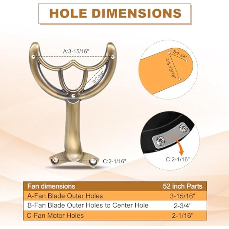 - Caution: Before purchasing, please make sure to measure and confirm the size of the fan blade arm holes to ensure they match your ceiling fan blades. Package does not include mounting screws, carefully go through the pictures and confirm the size of the holes before purchase.