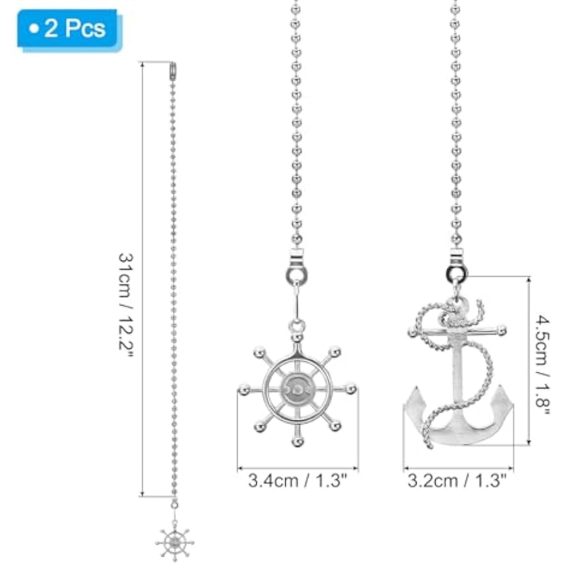 - Color: Silver Tone; Chain Material: Metal; Anchors Size: 45 x 32 x 5mm / 1.8 x 1.3 x 0.2 inch(L*W*T); Wheel Size: 34 x 2.8mm / 1.3 x 0.1 inch(D*T); Chain Length: 310mm / 12.2 inch; Packing List: 4 x Pull Chains for Ceiling Fans and Lights
