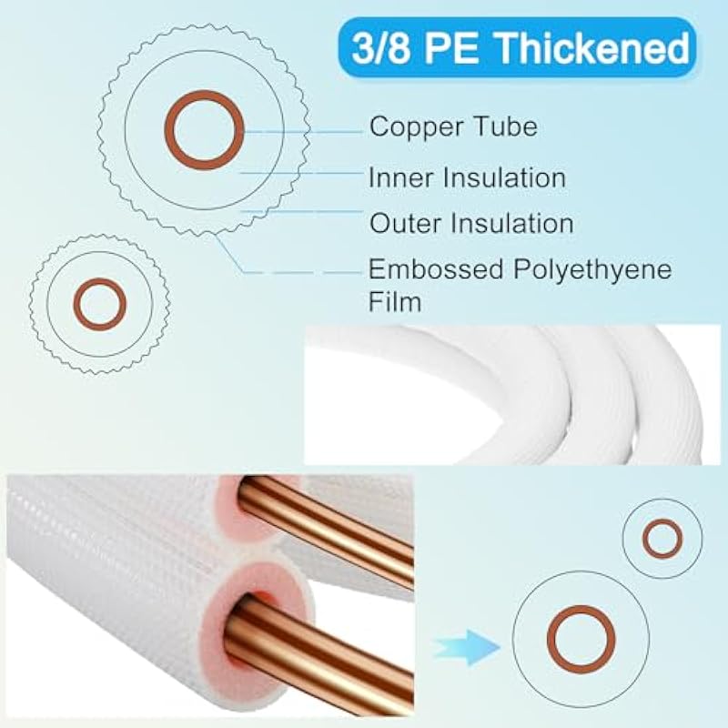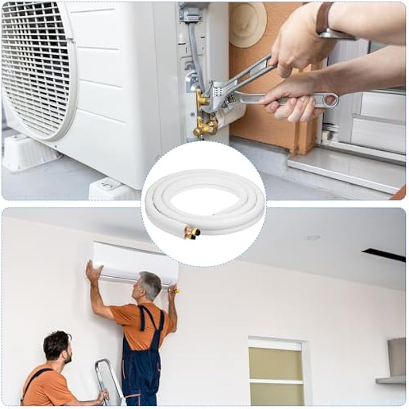 - Mini Split Line Set: The line extension for the split unit is made of good quality copper, corrosion-resistant and durable, any gas won’t leak out. The copper line set is structured by three-layer insulation cotton, which saves bills energy-saving for air conditioning and protects the copper pipe against wind, sunlight, and fire. Thickened anti-cracking nuts are anti-freeze, pre-flared ends for easy installation. The two-in-one design makes the line set easy to bend.